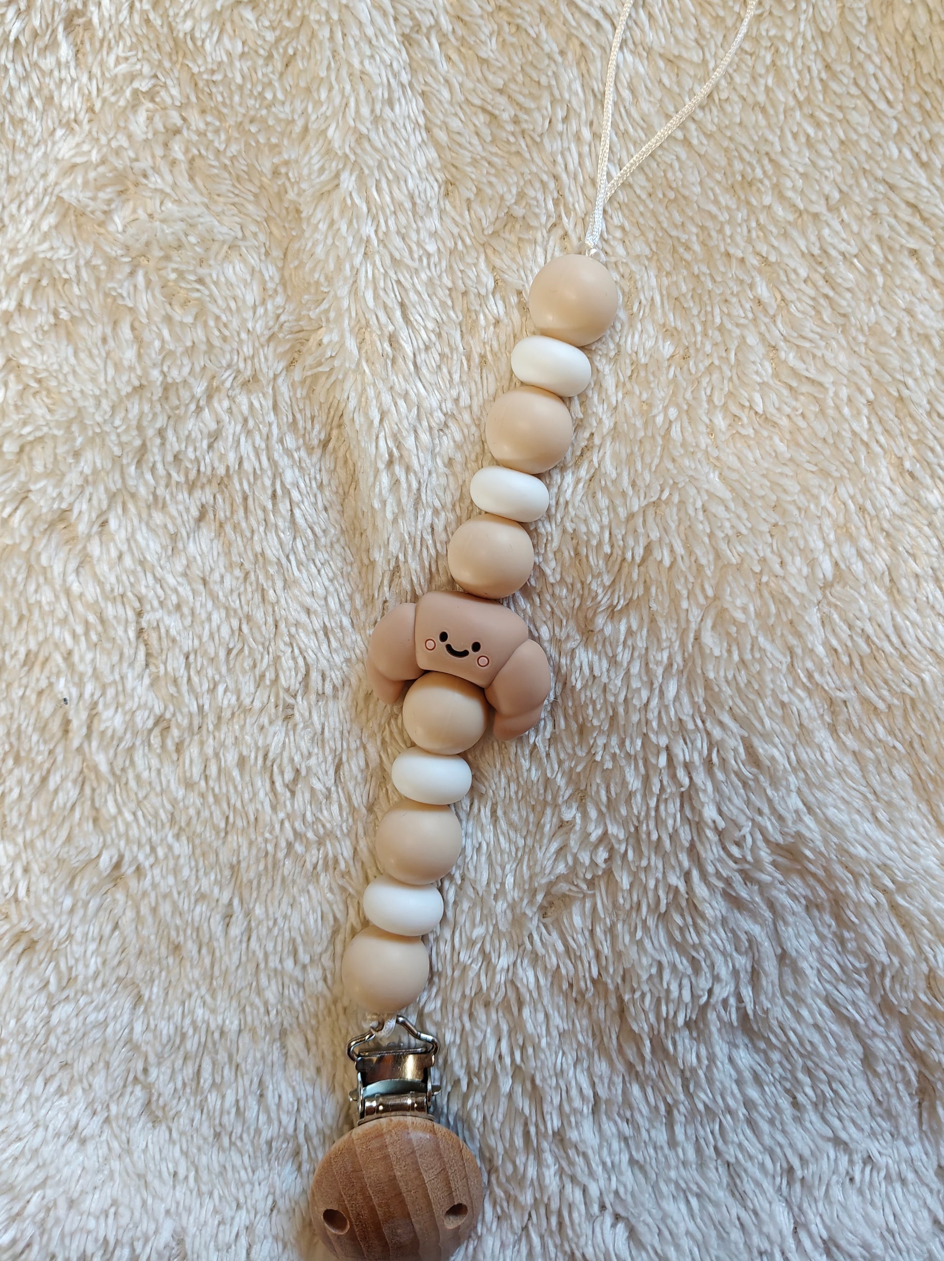 Hoe schattig is deze speenclip met een vrolijk croissantje? Perfect om het speentje van je kleintje altijd binnen handbereik te houden én er leuk uit te zien.