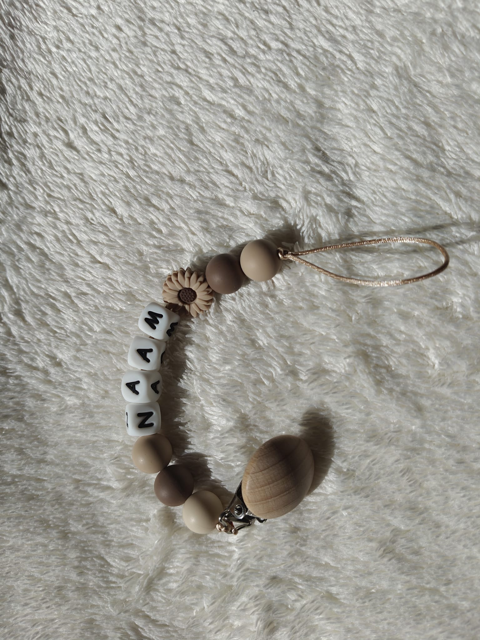 Dit speenkoord met naam heeft een tijdloze uitstraling door de neutrale bruin- en beigetinten. Het bloemdetail maakt het ontwerp extra lief en uniek. Perfect voor ouders die houden van rustige en natuurlijke kleuren.