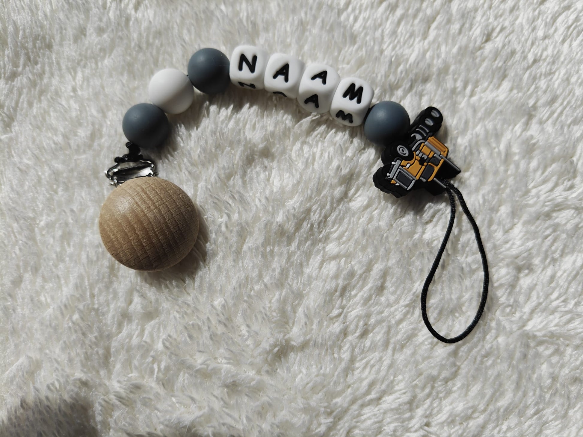 Dit persoonlijke speenkoord met naam is ideaal voor jouw kleintje. Voorzien van stoere grijs-witte kralen en een opvallende vrachtwagen, maakt dit speenkoord niet alleen handig maar ook uniek. De houten clip is eenvoudig vast te maken aan kleding, zodat het speentje niet kwijtraakt.